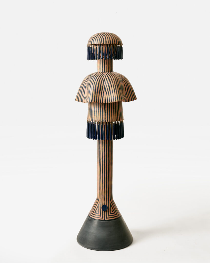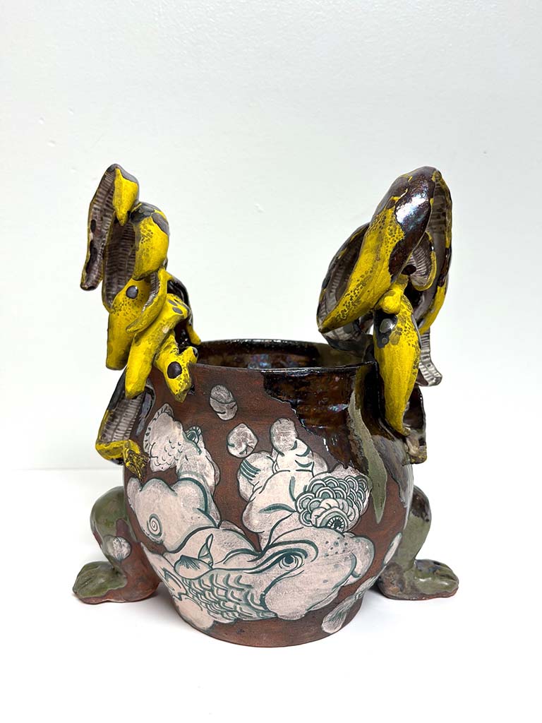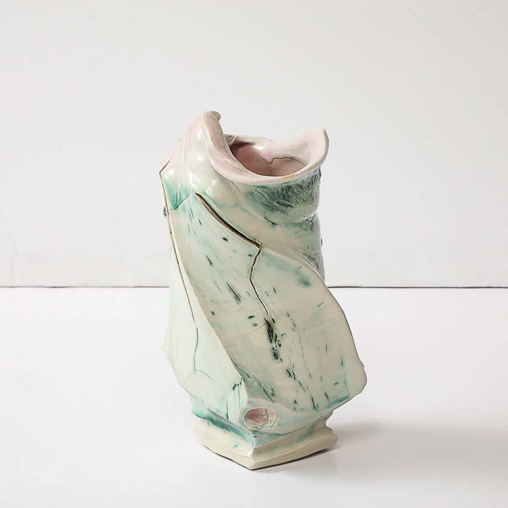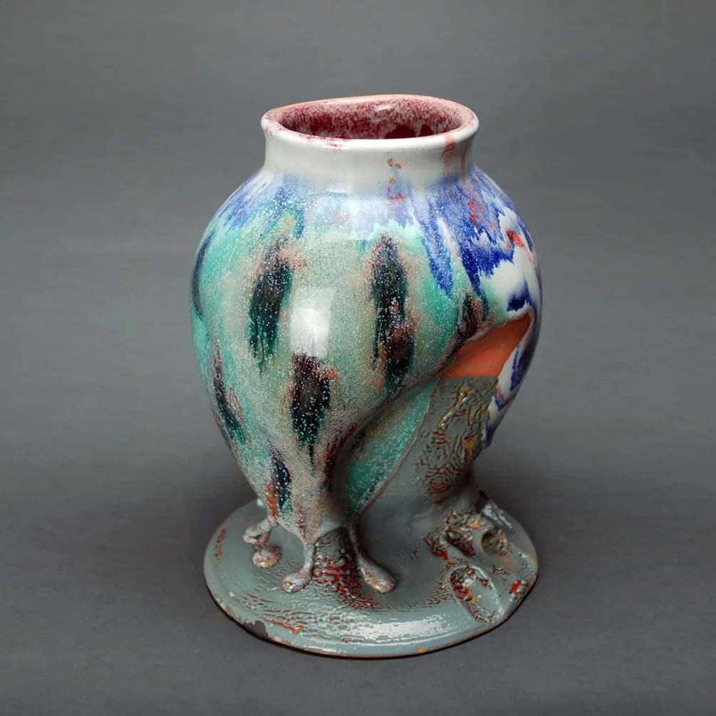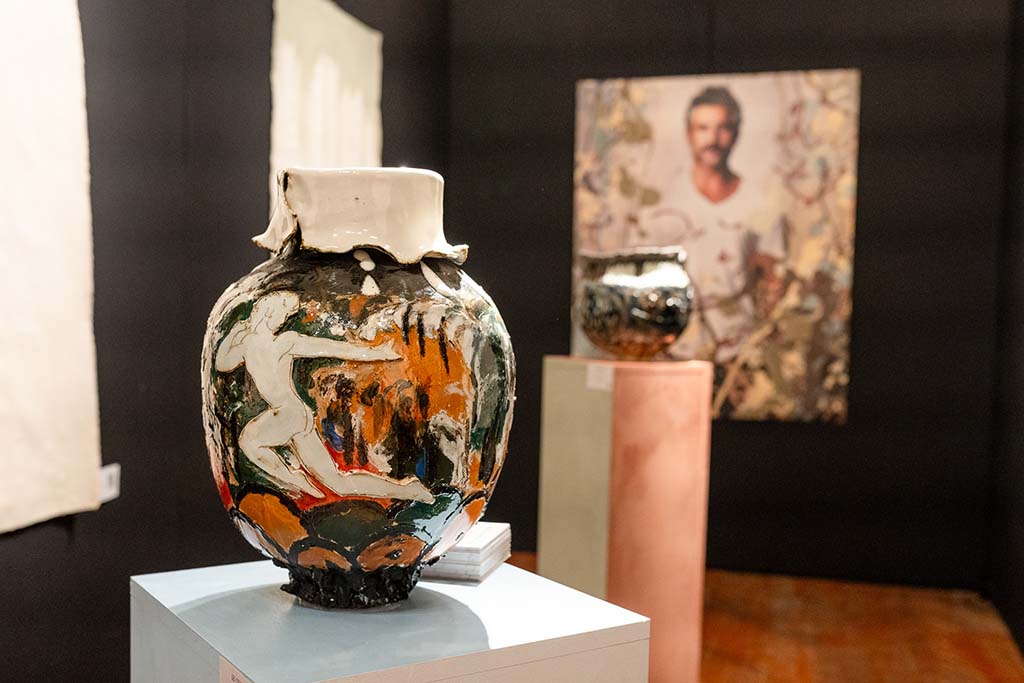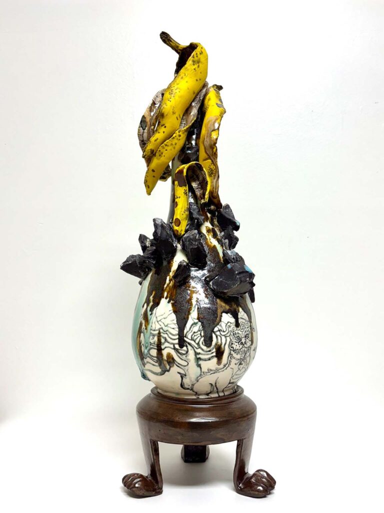 Hostler Burrows presents a memorable constellation of clay: the moss-green, fairytale figures of Kim Simonsson; Kirsi Kivivirta’s geometric stoneware wall pieces, composed from small, puzzle-like arrangements; and Irene Nordli’s convulsive, creaturely vessels—also on view at the gallery’s Tribeca location in Both Sides Now. Ippodo Gallery introduces works by Agnes Husz—spiraling slabs of clay that twist into abstract forms—and by Masahiro Maeda, whose iro-e practice reimagines traditional techniques through contemporary surface patterning. At Onishi Gallery, a concentrated display of Bizen ware—shaped by flame, ash, and centuries of tradition—provides a grounding counterpoint, with a more expansive presentation continuing through November 21 at the gallery’s Upper East Side location. At Shoshana Wayne Gallery, Jiha Moon’s narrative vessels—hybrid forms animated by folklore and pop-cultural gesture—take confident prominence, as LES Collection presents Gianfranco Briceño’s painted pots, their surfaces tracing intimate narratives of gender and sexuality.
