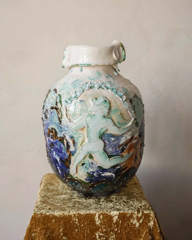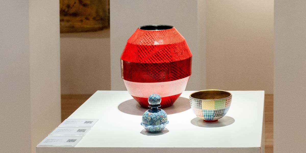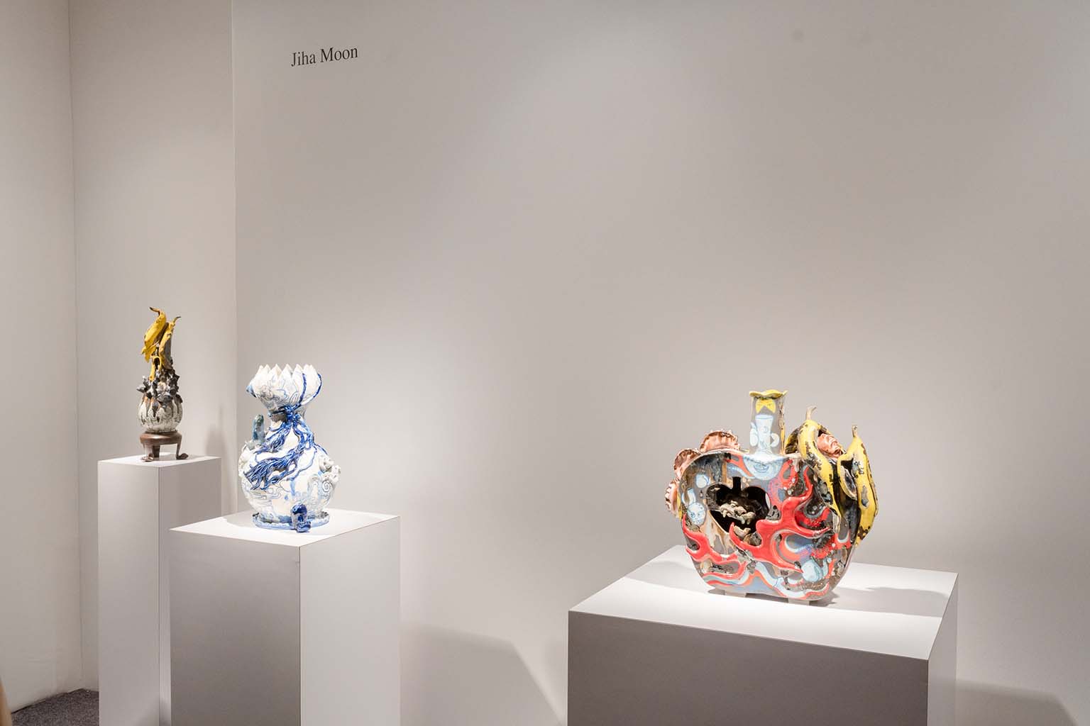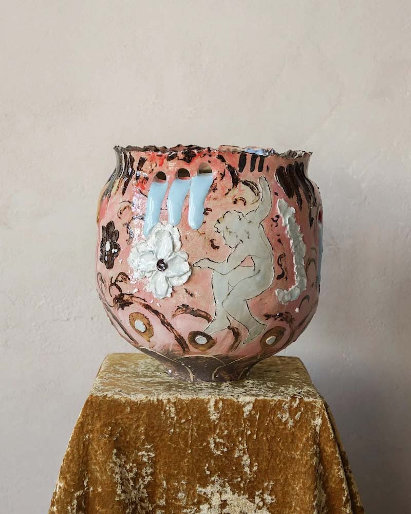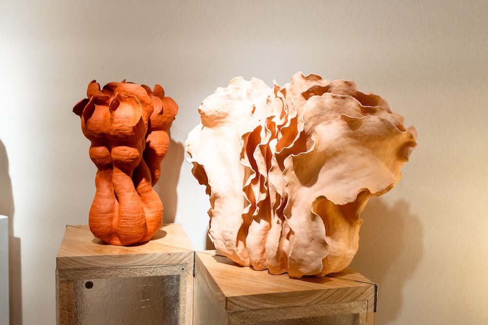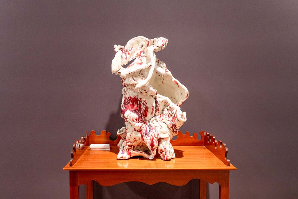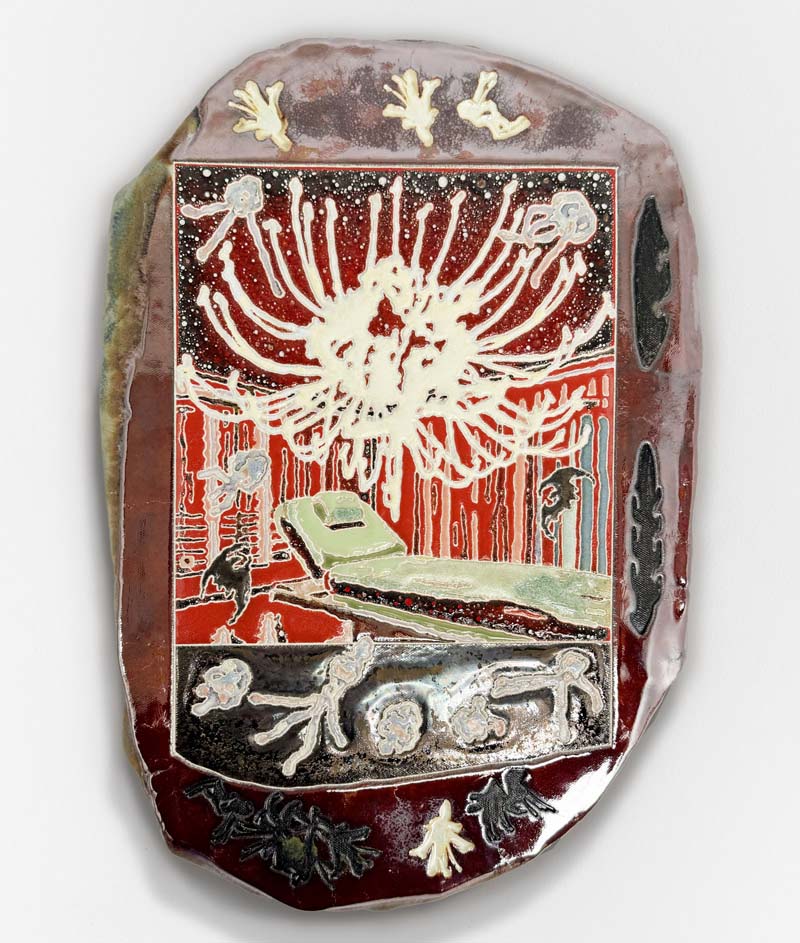 Hostler Burrows presents a memorable constellation of clay: the moss-green, fairytale figures of Kim Simonsson; Kirsi Kivivirta’s geometric stoneware wall pieces, composed from small, puzzle-like arrangements; and Irene Nordli’s convulsive, creaturely vessels—also on view at the gallery’s Tribeca location in Both Sides Now. Ippodo Gallery introduces works by Agnes Husz—spiraling slabs of clay that twist into abstract forms—and by Masahiro Maeda, whose iro-e practice reimagines traditional techniques through contemporary surface patterning. At Onishi Gallery, a concentrated display of Bizen ware—shaped by flame, ash, and centuries of tradition—provides a grounding counterpoint, with a more expansive presentation continuing through November 21 at the gallery’s Upper East Side location. At Shoshana Wayne Gallery, Jiha Moon’s narrative vessels—hybrid forms animated by folklore and pop-cultural gesture—take confident prominence, as LES Collection presents Gianfranco Briceño’s painted pots, their surfaces tracing intimate narratives of gender and sexuality.