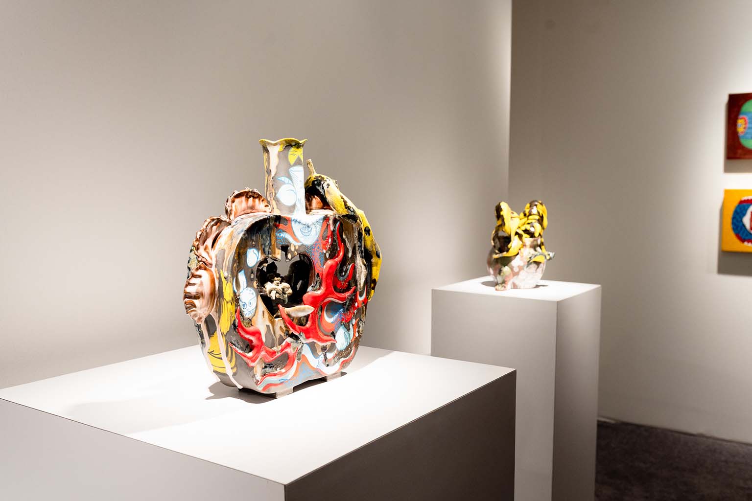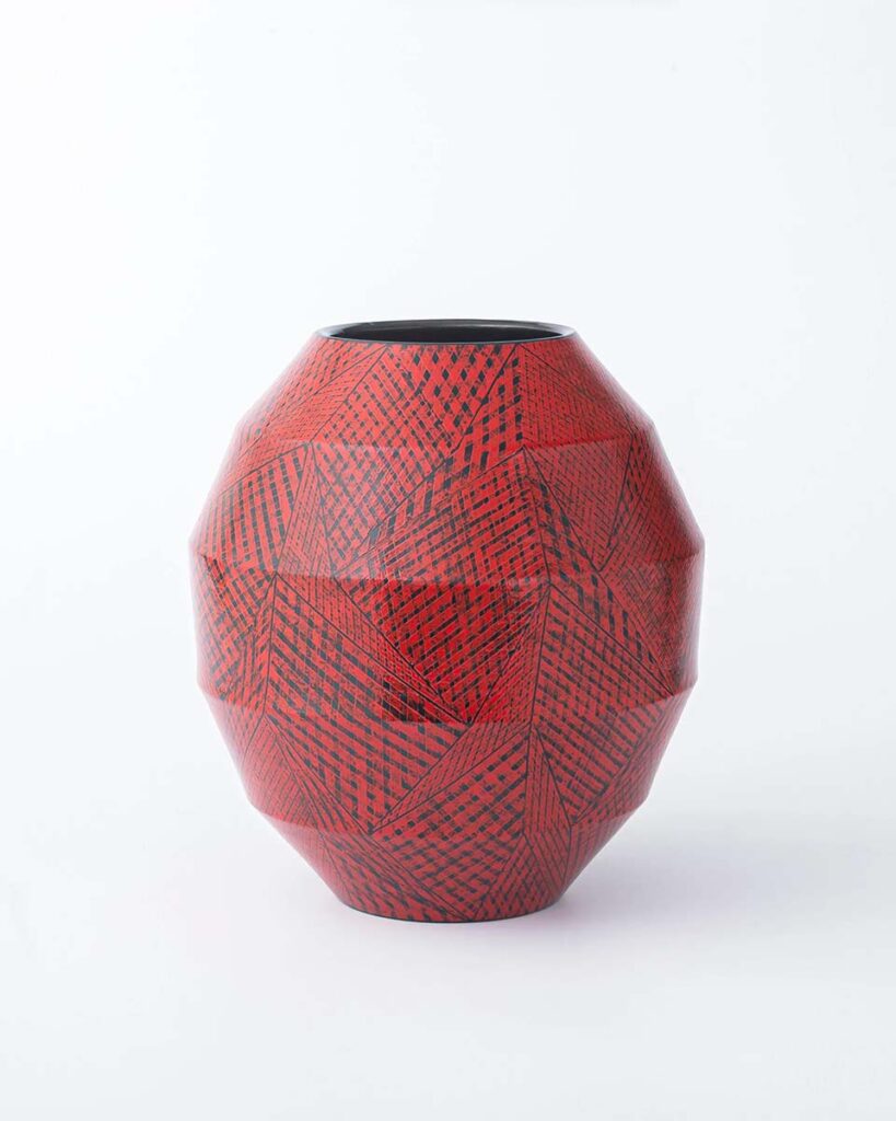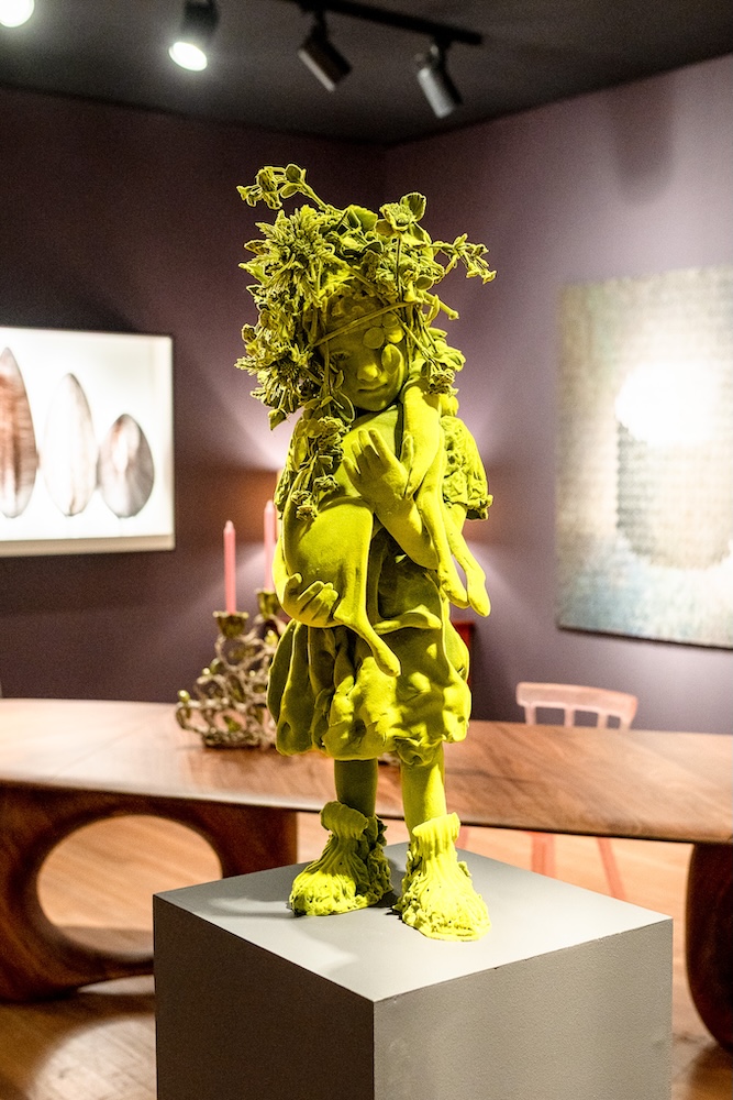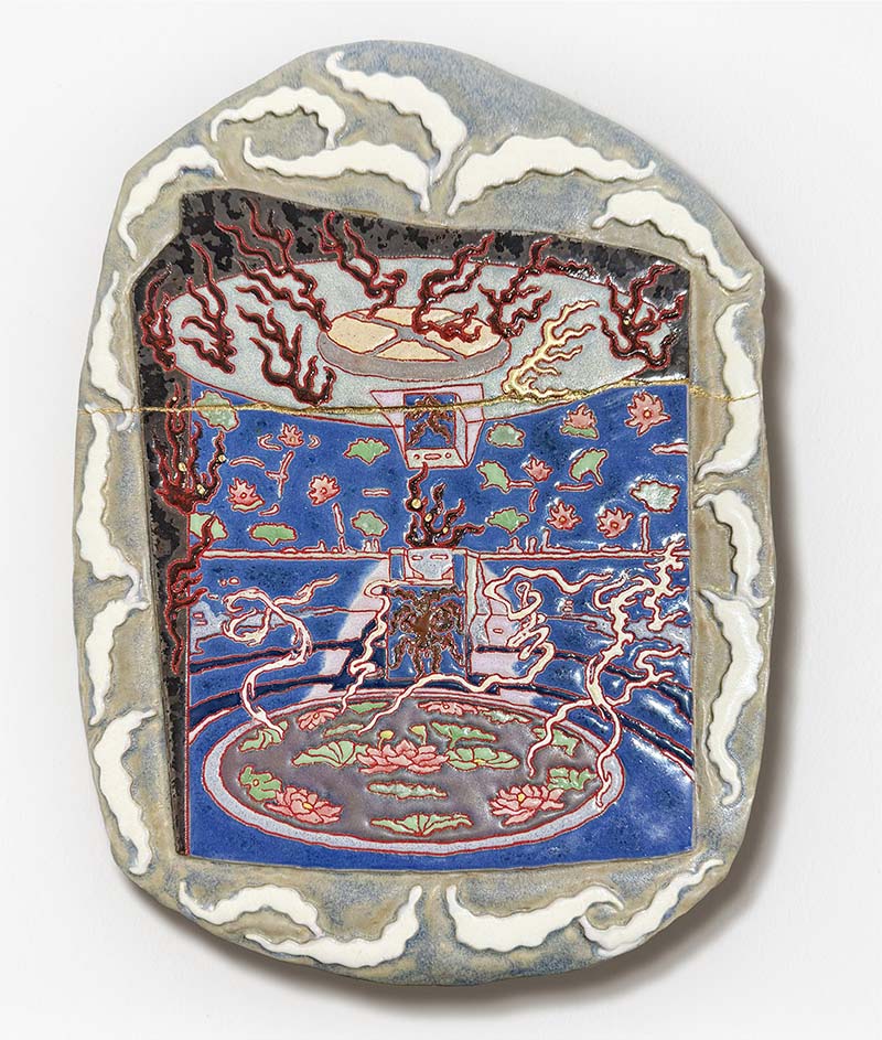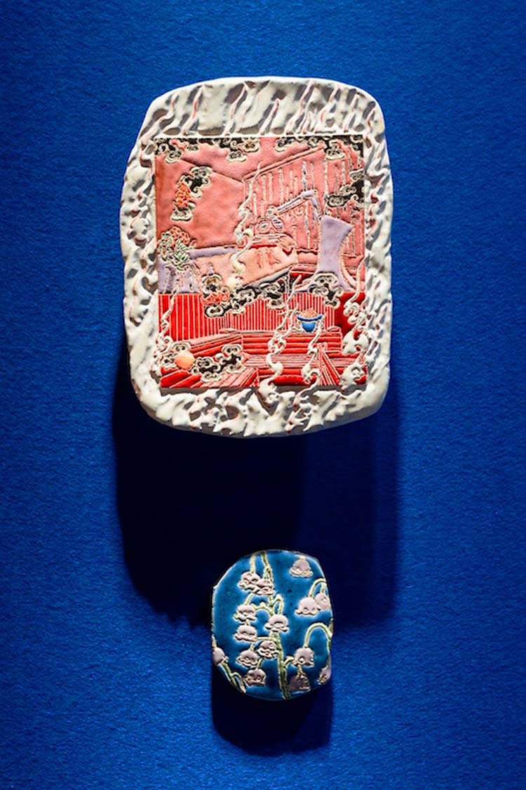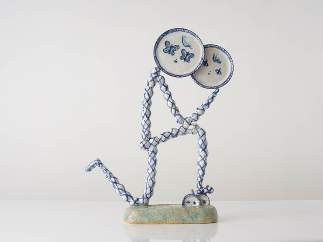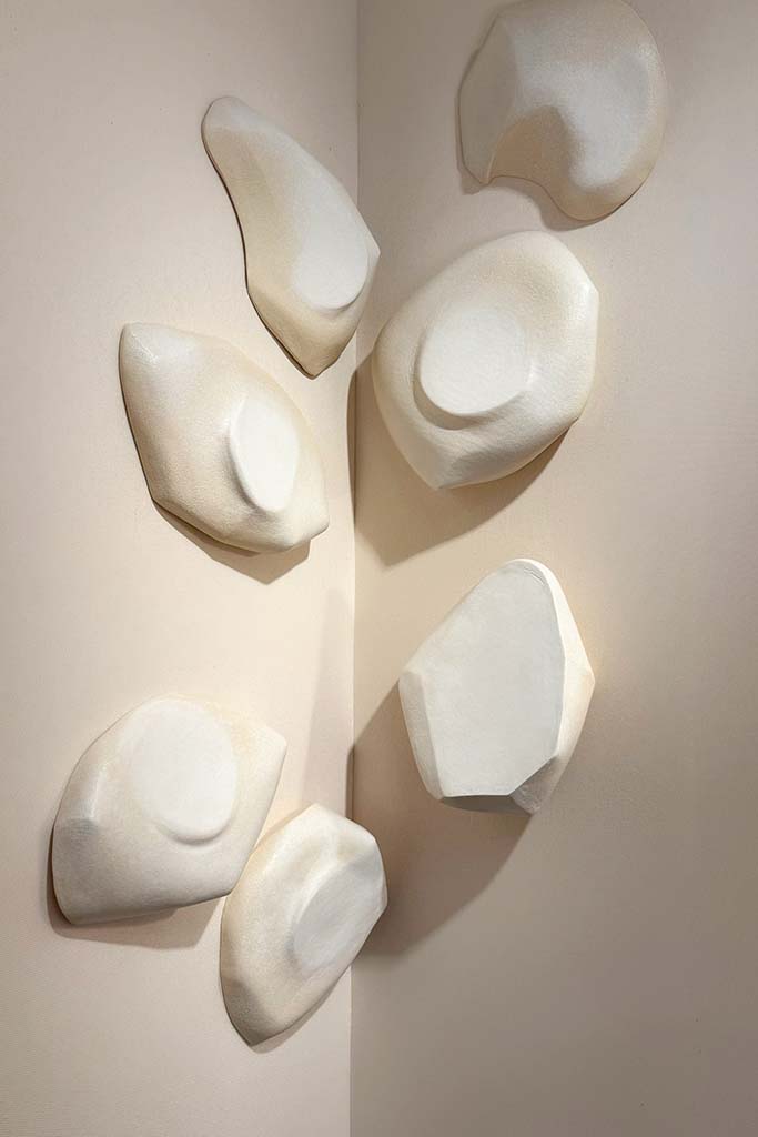 Hostler Burrows presents a memorable constellation of clay: the moss-green, fairytale figures of Kim Simonsson; Kirsi Kivivirta’s geometric stoneware wall pieces, composed from small, puzzle-like arrangements; and Irene Nordli’s convulsive, creaturely vessels—also on view at the gallery’s Tribeca location in Both Sides Now. Ippodo Gallery introduces works by Agnes Husz—spiraling slabs of clay that twist into abstract forms—and by Masahiro Maeda, whose iro-e practice reimagines traditional techniques through contemporary surface patterning. At Onishi Gallery, a concentrated display of Bizen ware—shaped by flame, ash, and centuries of tradition—provides a grounding counterpoint, with a more expansive presentation continuing through November 21 at the gallery’s Upper East Side location. At Shoshana Wayne Gallery, Jiha Moon’s narrative vessels—hybrid forms animated by folklore and pop-cultural gesture—take confident prominence, as LES Collection presents Gianfranco Briceño’s painted pots, their surfaces tracing intimate narratives of gender and sexuality.