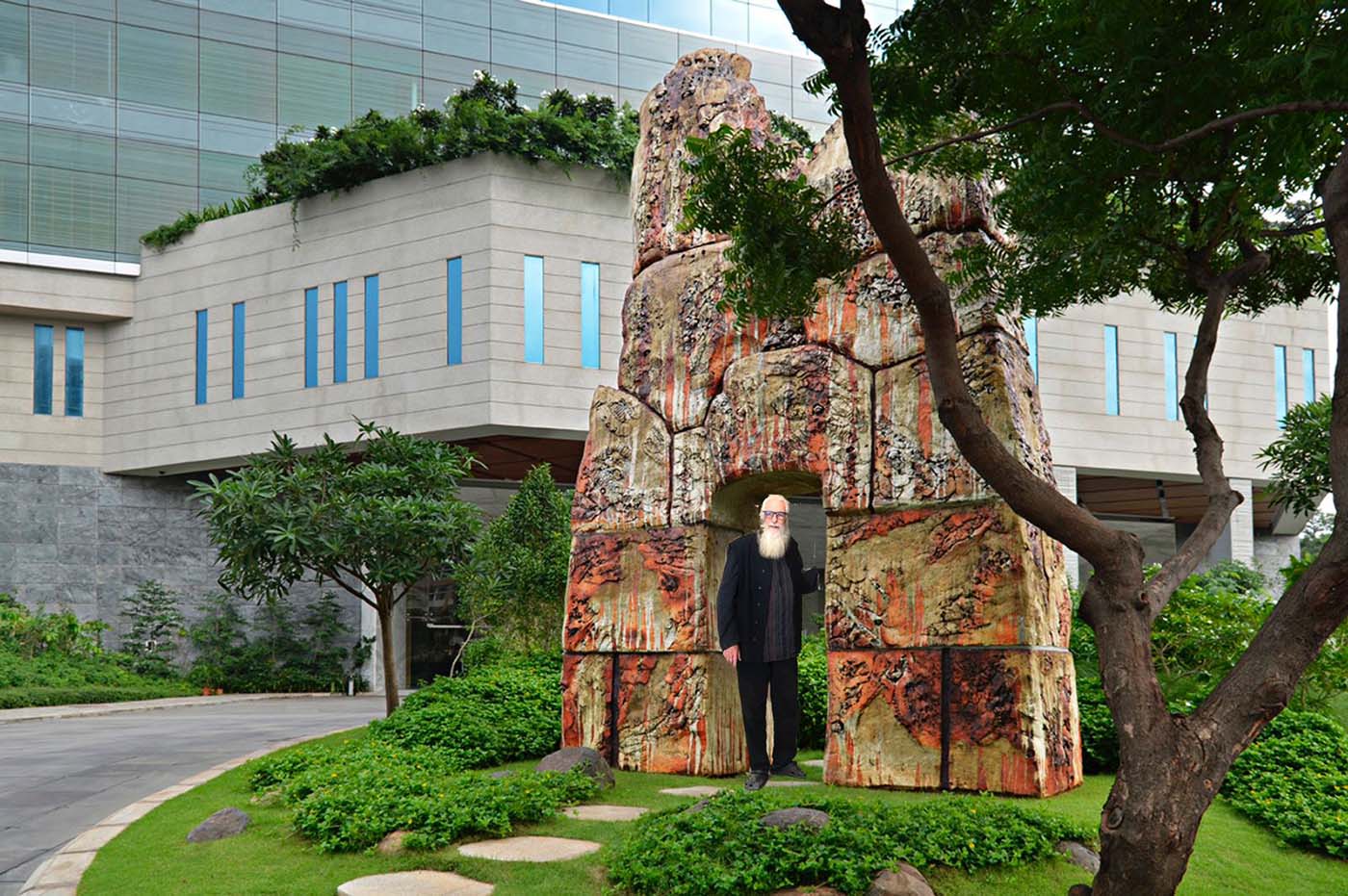 It is incredible to note, however, that Ray didn’t do much pottery or sculpture for more than a decade, between 1984 and 1995. Completely consumed by the Fired House project, Ray spent his energies on a quest for sustainable low-cost housing. Inspired first by Egyptian architect Hassan Fathy’s Architecture for the Poor, and then by Iranian architect Nader Khalili’s Ceramic Houses: How To Build Your Own, Ray undertook what can be seen as pioneering socially relevant architectural research work—a new approach to possible energy-efficient ways of building. I was fortunate enough to assist him on various such projects between 1990 and 1993, and saw this work from a more poetic and lyrical point of view. This was a great dance of form and fire—mellifluous mud sculptures were built in a configuration of domes and vaults; these were then loaded with bricks made from the earth upon which they stood, and terracotta ware fashioned by traditional artisans; finally fired as giant kilns, over days and nights—purified by fire, they were born as homes to live in. Surely a precursor to his explorations at mammoth scale of sculpture and installation work that followed in subsequent years.