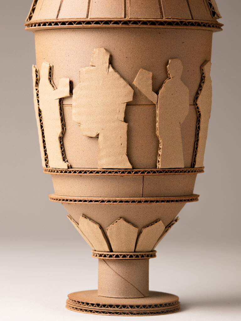 Elif Uras | Wheels of Labor | 2025 | underglaze, glaze and gold luster on stonepaste | 75 x 37 x 37 cm