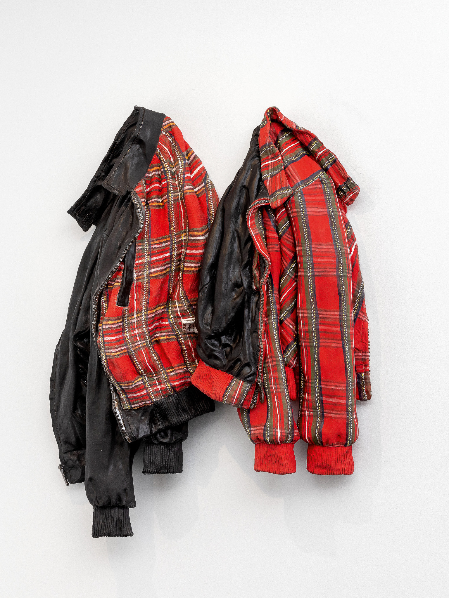 Nearly everything is ceramic, save for a wallpaper derived from a smaller ink drawing titled Blaue Männer, where nearly naked men hover midair like cheeky cherubs, a joyous snarl of bodies caught in motion. Glazed jockstraps, briefs, and Nike socks are superimposed across this whirl of whimsy, affixed to the painting as if shaken loose mid-flight.