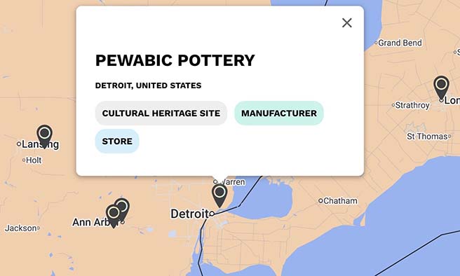 Visit Pewabic Pottery House and explore other manufacturers, studios, and ceramic destinations in the US through Ceramic World Destinations (CWD), MoCA/NY’s interactive map featuring over 4,000 ceramic sites worldwide.